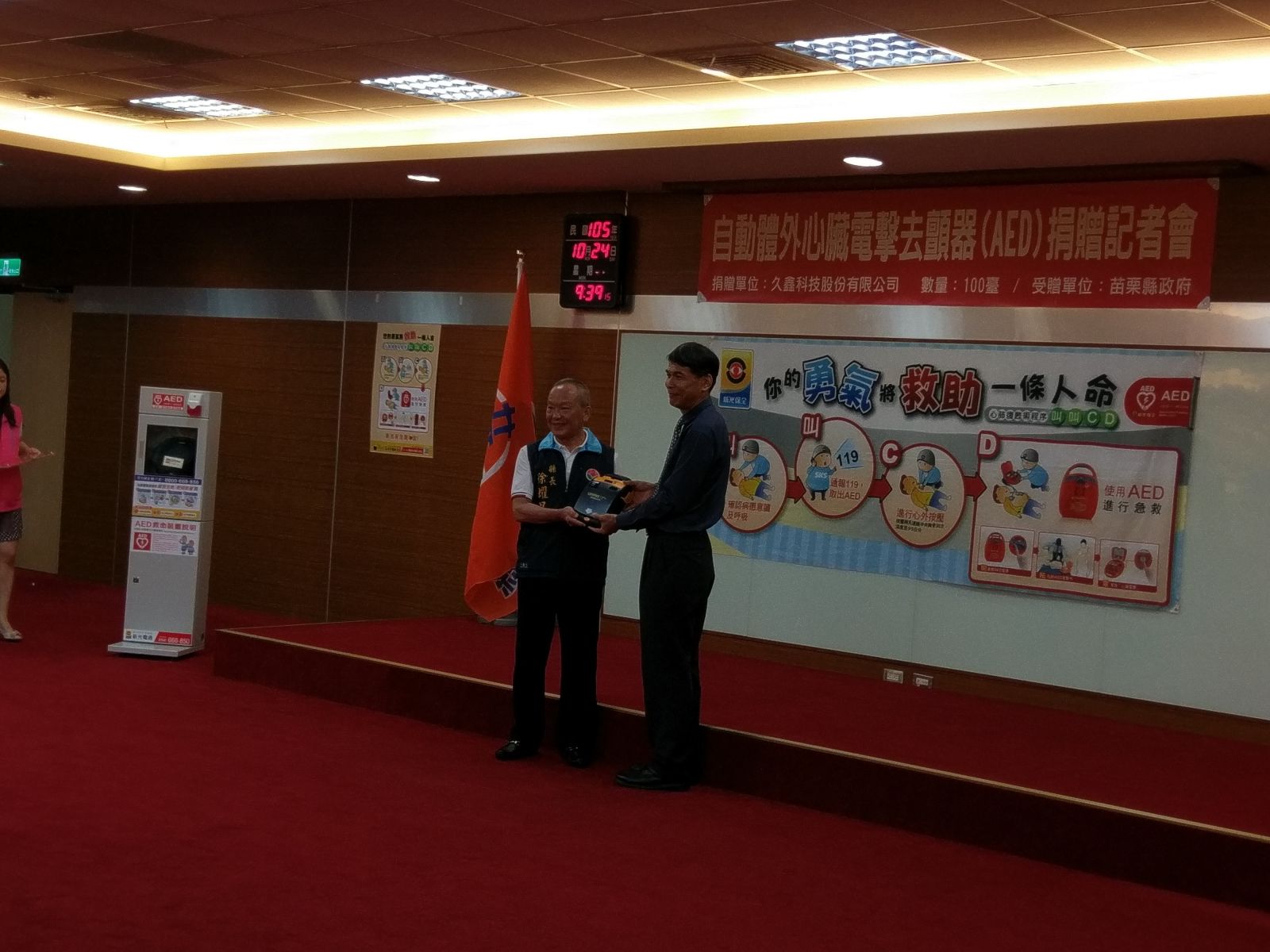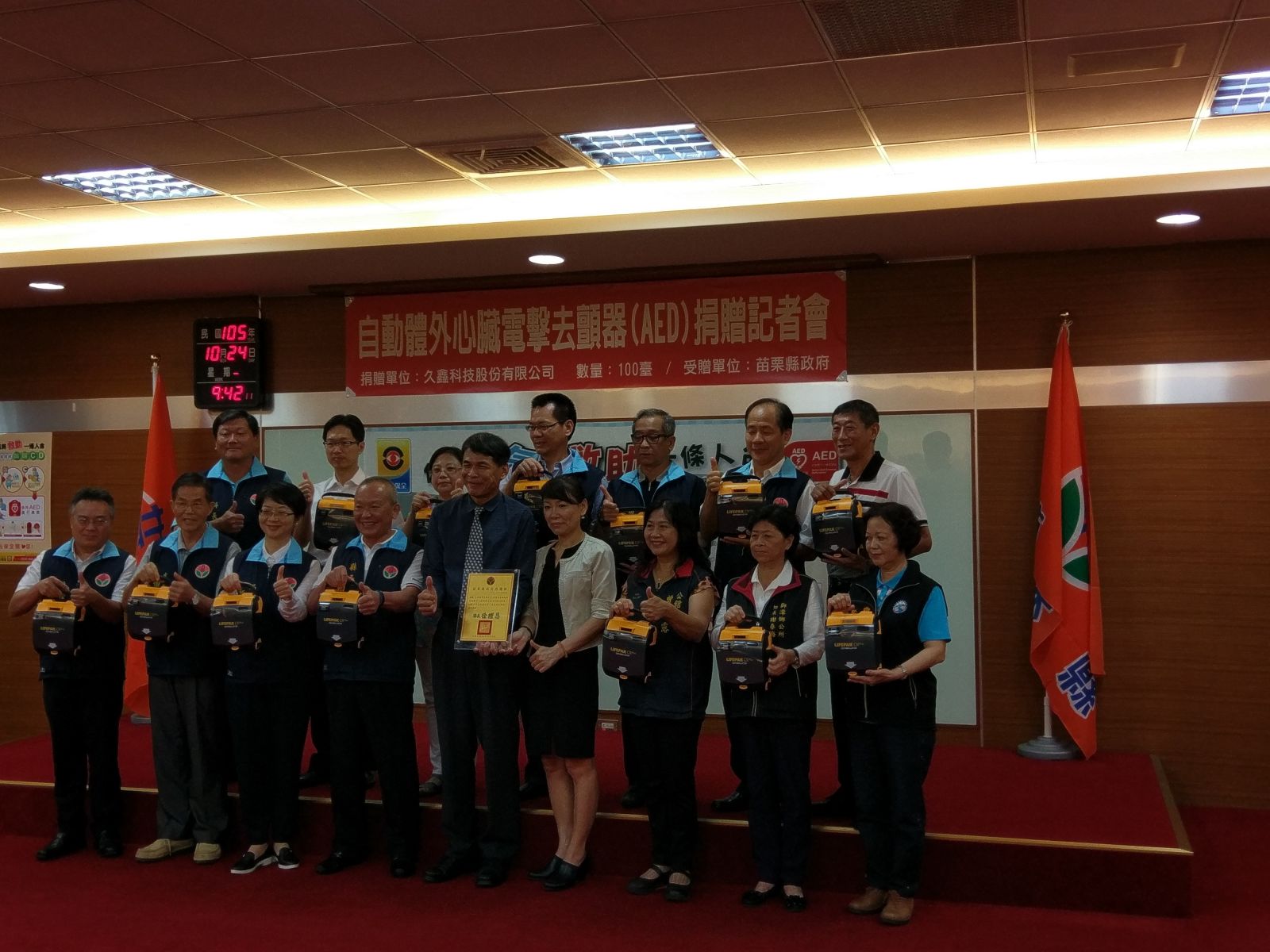 地域への貢献活動は、苗栗県政府をAEDを寄贈することにしました